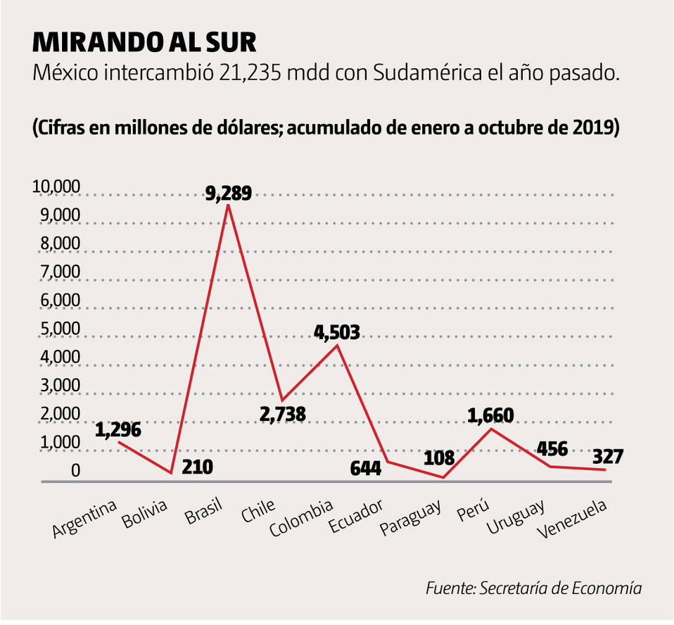 En el periodo enero-octubre, el comercio con los vecinos del sur ascendió apenas a 21,235.5 mdd, 2.7% del intercambio total. En ese mismo período, las exportaciones mexicanas a Sudamérica sumaron 11,208.9 mdd, 2.9% del total de las ventas externas.