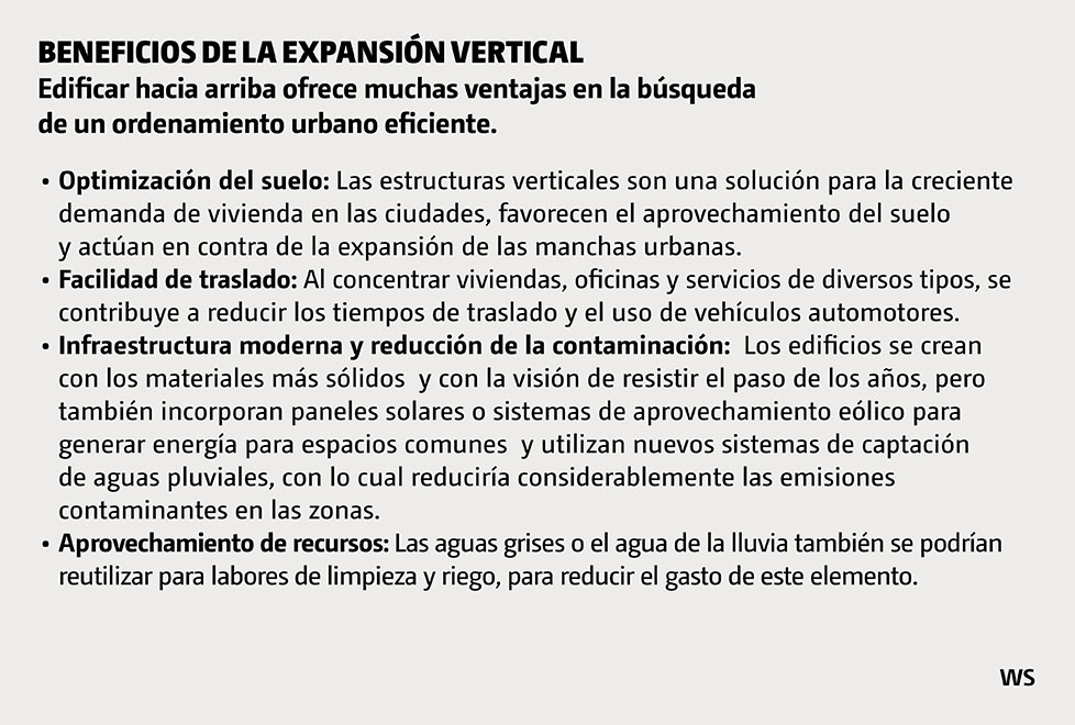 El presidente de la desarrolladora Orange Investments Carlos Rousseau dice que más que una tendencia, la verticalidad es una estrategia de reestructuración para los espacios que ya son insuficientes. Pero la ventaja más importante de las ciudades verticales es que ayudan a construir espacios ordenados en asentamientos urbanos limitados, cuando el crecimiento de la ciudad es acelerado.