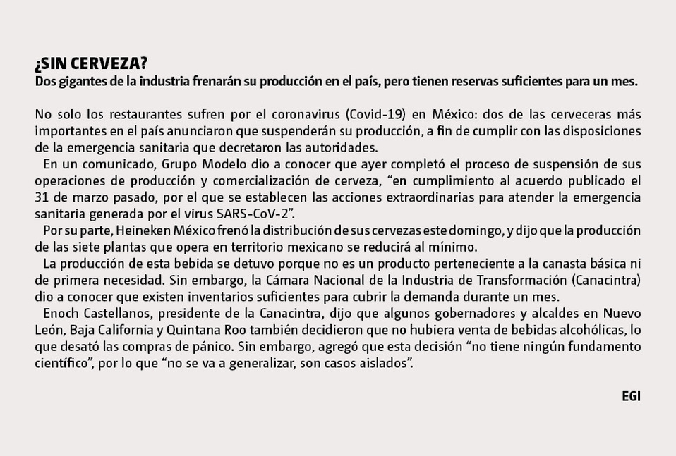 En el caso de la industria cárnica, que emplea a unas 80,000 personas en el país, según datos del INEGI, el Consejo Mexicano de la Carne se ha comprometido a mantener la producción para asegurar el abasto de las familias. Asimismo, los Rastros Tipo Inspección Federal y la cadena de distribución siguen funcionando de manera habitual, con las medidas de prevención e higiene que recomiendan las autoridades sanitarias.