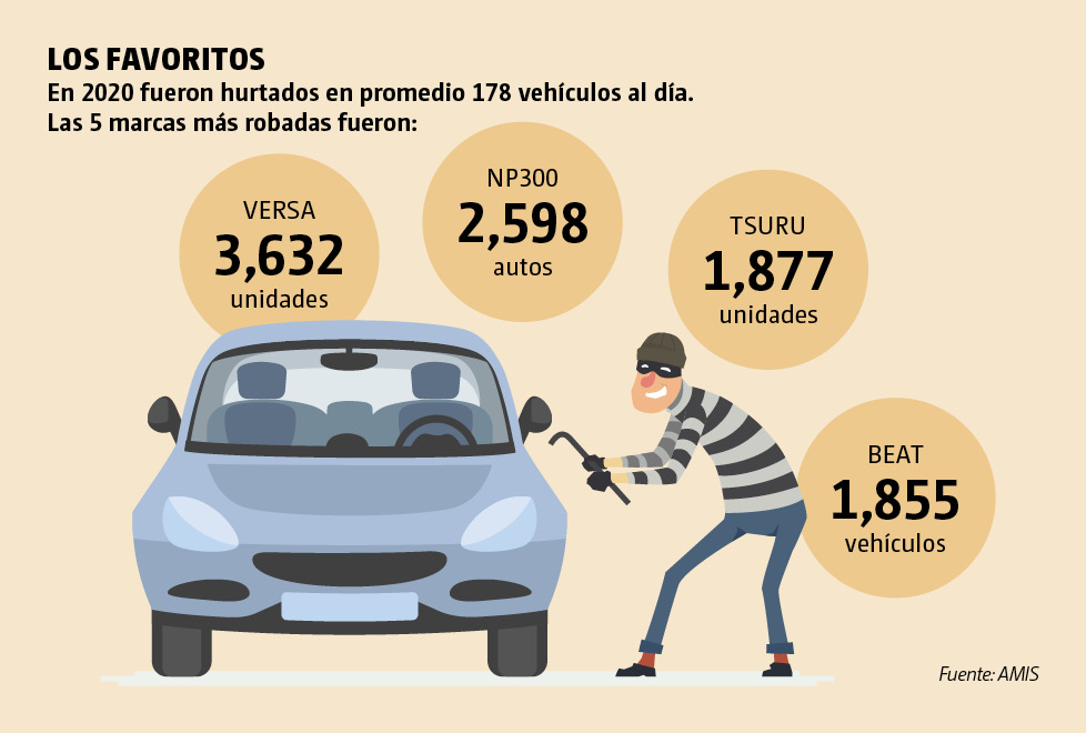 Las marcas más robadas fueron el Versa, NP300 y Tsuru de Nissan, y el AVEO y Beat de Chevrolet. La AMIS dijo que estos autos son los más robados debido a que son modelos muy comunes entre los taxistas y cuyas refacciones tienen gran demanda en el mercado.