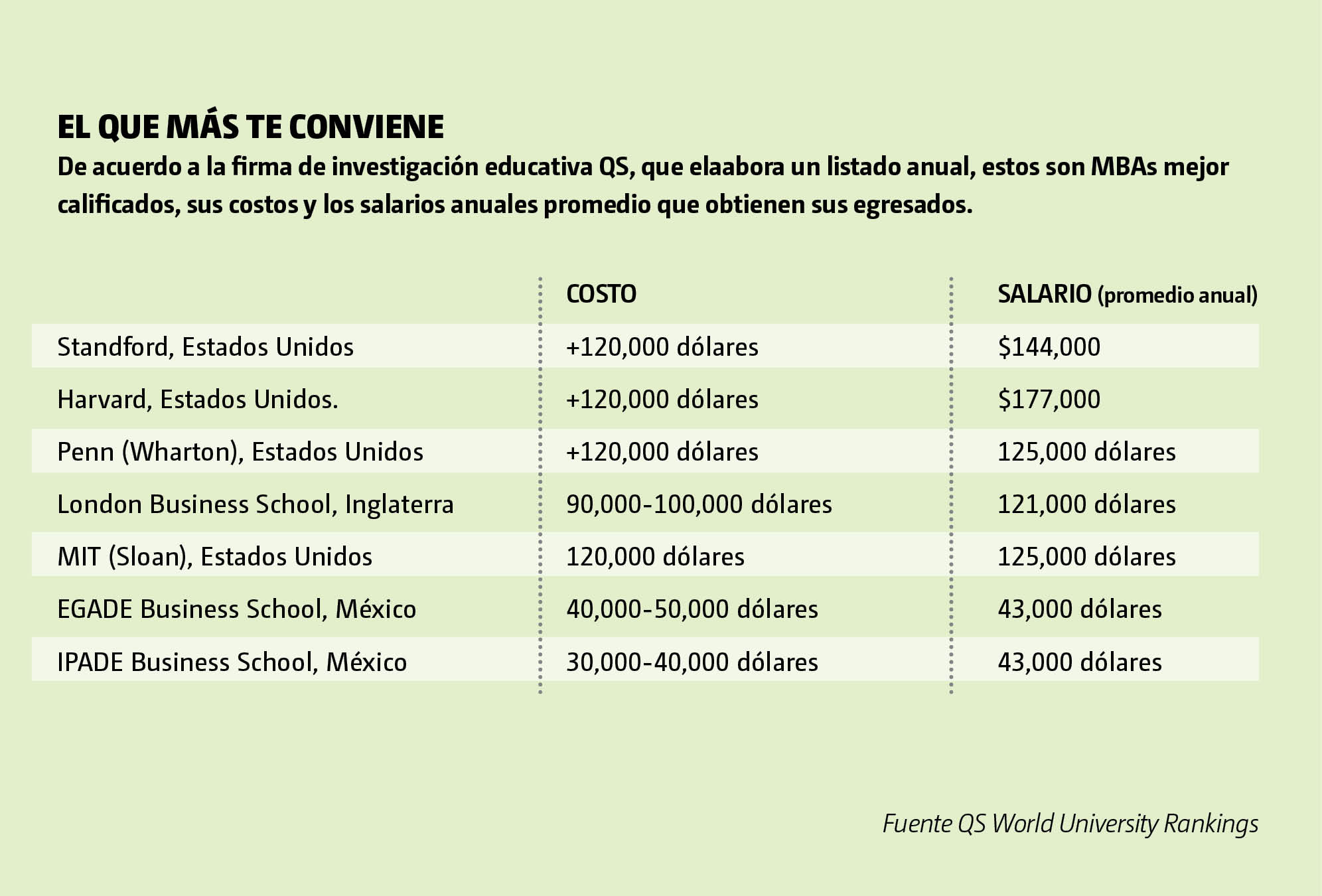 La experiencia de Claudia Amezcua en ese sentido es alentadora: “Hay un salto muy importante, una persona puede duplicar y hasta triplicar su sueldo en dos años, cosa que no sucede si te quedas en tu trabajo ese mismo periodo de tiempo”, explica. Estudiar un MBA de tiempo completo, agrega, “equivale aproximadamente a cinco años de experiencia de trabajo”.