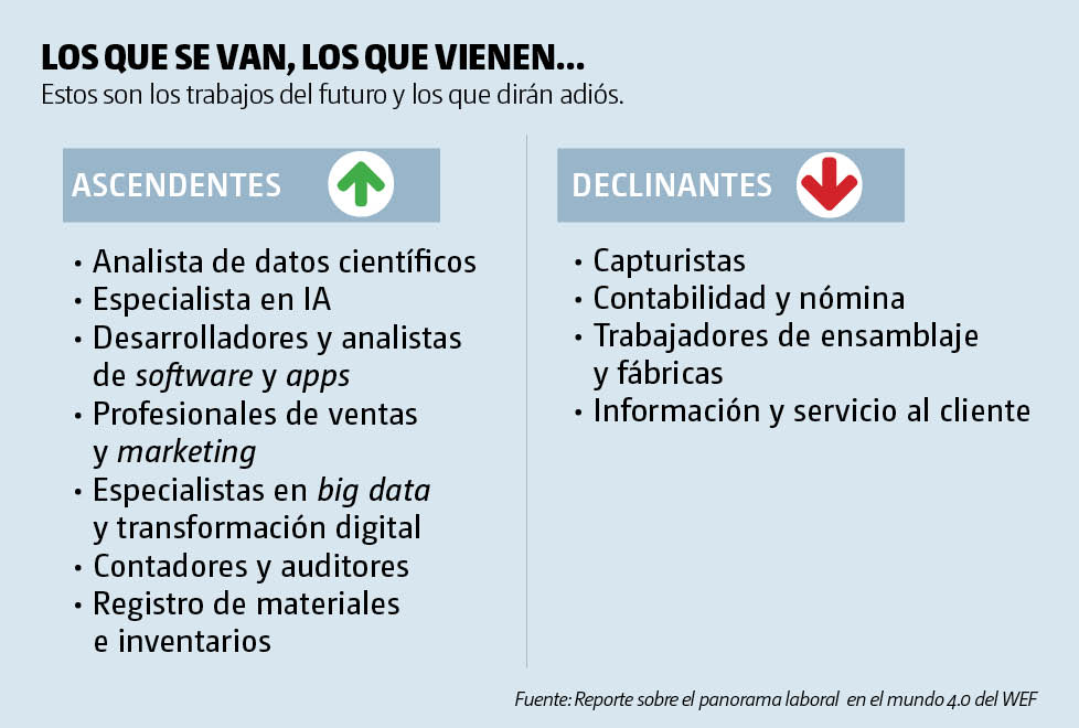 Los retos en esta cuarta revolución tecnológica son, por un lado, generar otro tipo de ocupaciones en cantidad y ritmo suficiente para asimilar a todos los desplazados, y por el otro, la necesidad urgente de que los empleados se renueven, pues 54% de esos empleos requerirá la adquirir de nuevas habilidades significativas que permitan aprovechar las oportunidades de crecimiento por venir.