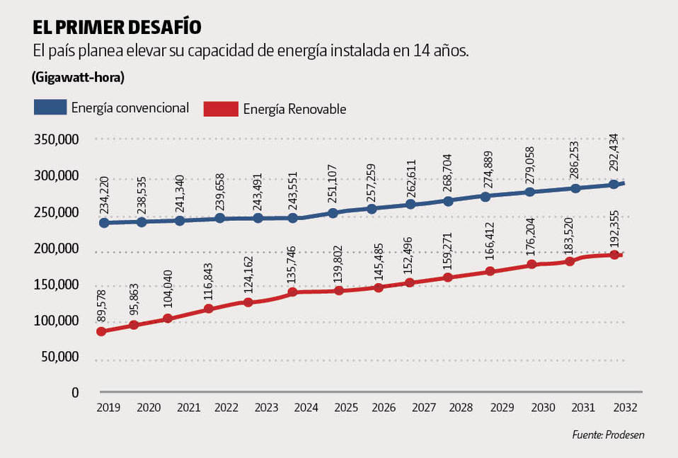 La actual administración planea, por medio del Prodesen para el periodo de 2019-2033, la instalación de 18,880 megawatts únicamente por parte de la CFE entre 2019 y 2025, lo que equivale a 27% de la capacidad actual del país.