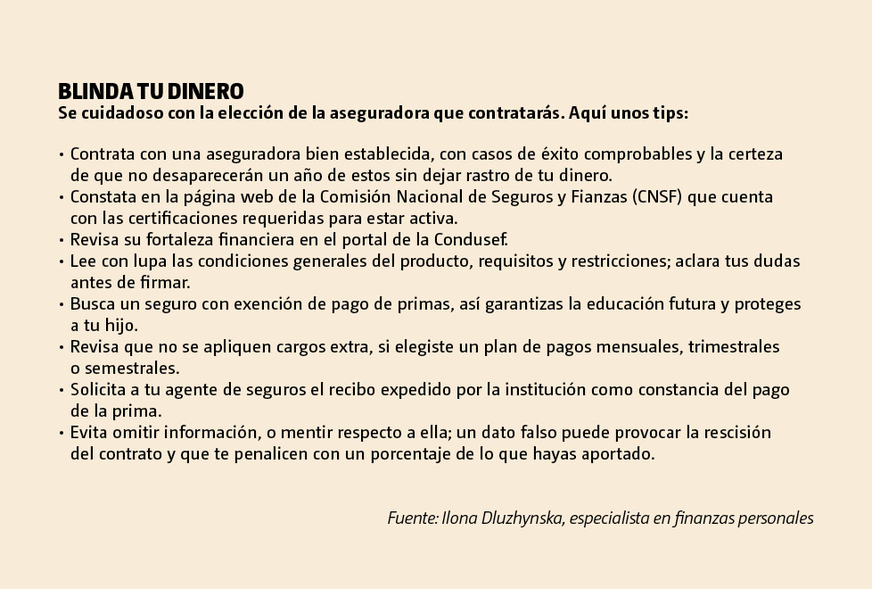 Ilona Dluzhynska, directora ejecutiva de la agencia Amo mis finanzas, asegura que es importante contar con el apoyo de un asesor financiero que te ayude a entender por completo el contrato al que estarás comprometido y a determinar el presupuesto que debes destinar al seguro educativo, así como a establecer prioridades y distribuir el ahorro para la educación de tus hijos de manera equitativa, en el caso de que tengas más de uno.