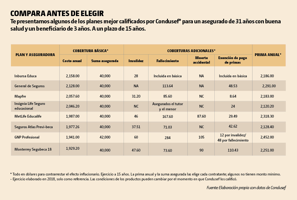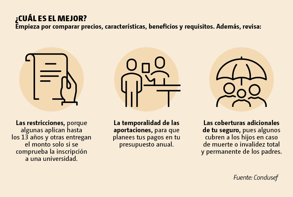 Una vez que la familia tomó la decisión de contratar un seguro educativo, debes comparar la oferta existente en el mercado: precios, características, requisitos, beneficios y restricciones. Este análisis te permitirá elegir el que más convenga a tu situación personal.