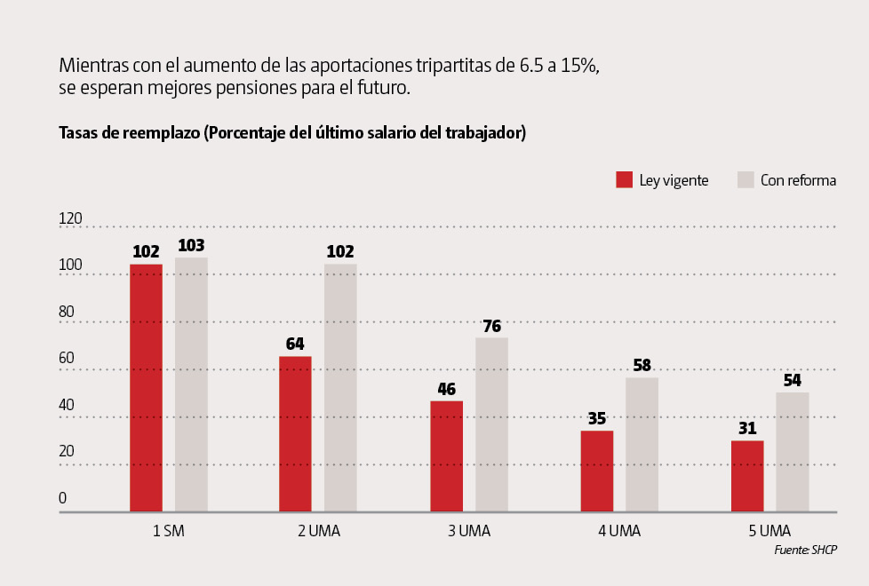 En este contexto, el presidente Andrés Manuel López Obrador presentó, junto con la Iniciativa Privada (IP) y el sector patronal, una iniciativa de reforma a la Ley del Seguro Social para aumentar en promedio 40% la tasa de reemplazo (pensión) de los futuros jubilados.