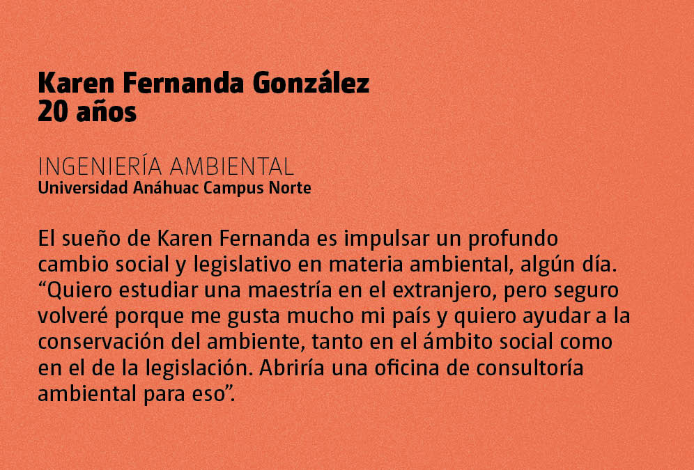 Este año presentó un proyecto en Quebec, Canadá, en el congreso de la Conferencia Anual 112 de la Air & Waste Management Association, con el que ganó el primer lugar de la categoría Undergraduate Student Poster Competition 2019. “Quiero hacer un cambio en la sociedad, no me conformo solo con estudiar”, comenta Karen, quien luego de cambiar la química por la ingeniería ambiental tuvo que lidiar con los cuestionamientos de su padre. “Se la pasaba preguntándome por qué elegí esta carrera. Es simple: se enfoca completamente al área que me gusta, porque es ciencia que impacta en la sociedad”.