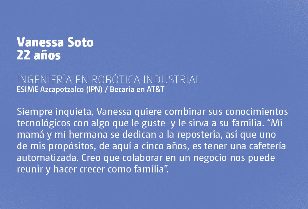 Vanessa Soto 22 años Ingeniería en Robótica Industrial ESIME Azcapotzalco (IPN) / Becaria en AT&T Siempre inquieta, Vanessa quiere combinar sus conocimientos tecnológicos con algo que le guste y le sirva a su familia. “Mi mamá y mi hermana se dedican a la repostería, así que uno de mis propósitos, de aquí a cinco años, es tener una cafetería automatizada. Creo que colaborar en un negocio nos puede reunir y hacer crecer como familia”.