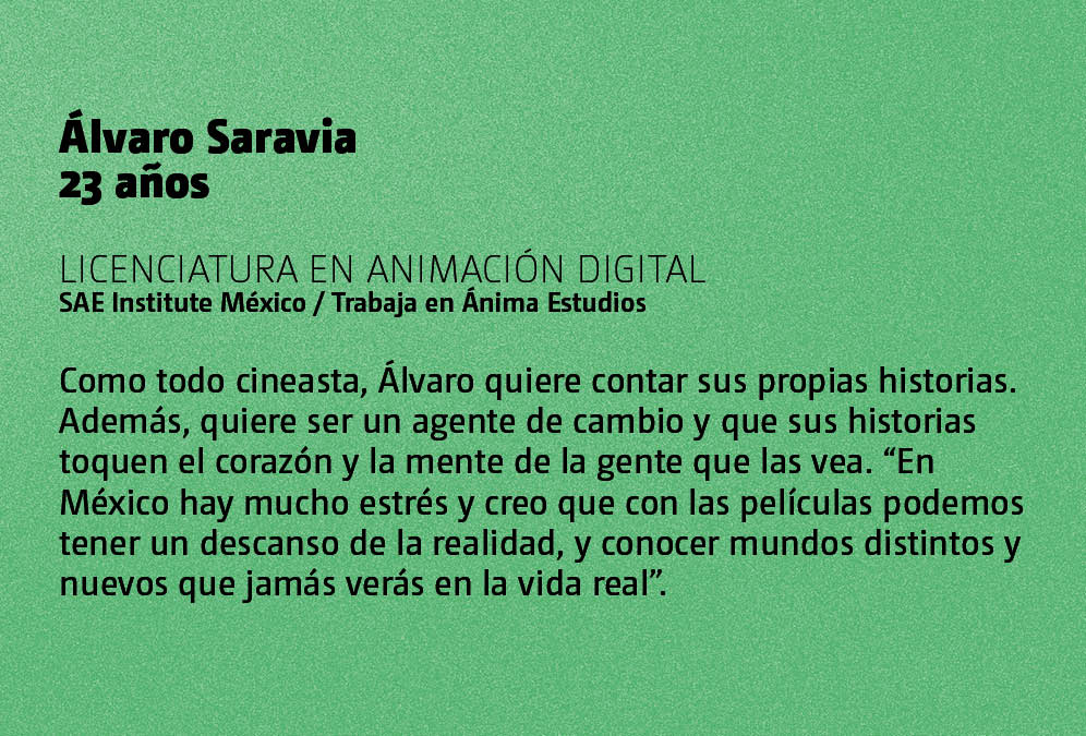 Álvaro es cineasta, pero confiesa que llegado el momento de elegir carrera no sabía bien qué estudiar. Se decidió por la animación digital porque “todo el mundo tiene una película o una historia que le cambió la vida y le ayudó a ser la persona que es y la ha llevado a donde está. Y luego, de repente, me topé con SAE México -su universidad- y me pareció fantástico poder contar mis historias de esa manera”.
