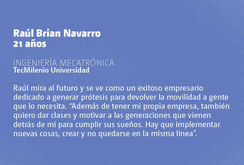 Una vez que las matemáticas fueron sus amigas, Raúl hizo de ellas un recurso para alcanzar su meta. Hoy estudia Ingeniería Mecatrónica porque piensa que es el camino “para ayudar a las personas”. Quería ser médico, hasta que en una sala de hospital vio salir personas sin un brazo o pierna y decidió que lo suyo era la Ingeniería Biónica. Pero como "es una carrera muy nueva, muy solicitada, complicada, y sobre todo muy costosa, opté por Mecatrónica, una carrera algo incomprendida. Mucha gente piensa que solo haces robots, pero no solo es robótica, también es mecánica, electrónica y control digital... abarca muchas ramas”.