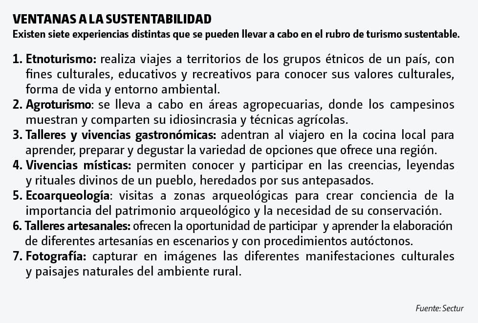 Una vertiente importante del turismo sostenible es el rural, que responde a los esfuerzos del gobierno para estimular proyectos turísticos en zonas rurales. “Así se aprovecha la riqueza cultural y natural de México, y se ayuda a las comunidades para que se vuelvan económicamente activas”, dice Rocío Lancaster, directora de Promoción Turística de Jalisco.