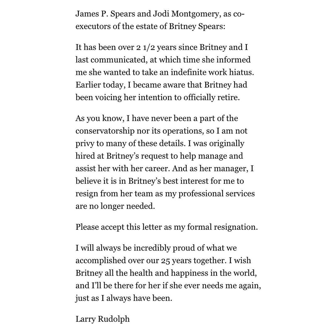 Larry Rudolph, quien ha acompañado a Britney Spears durante buena parte de su carrera, decidió concluir la relación de trabajo con la estrella del pop, informó el medio estadunidense Variety, que citó una carta del agente enviada a su padre en torno a la intención de la artista de abandonar de manera definitiva el canto profesional.