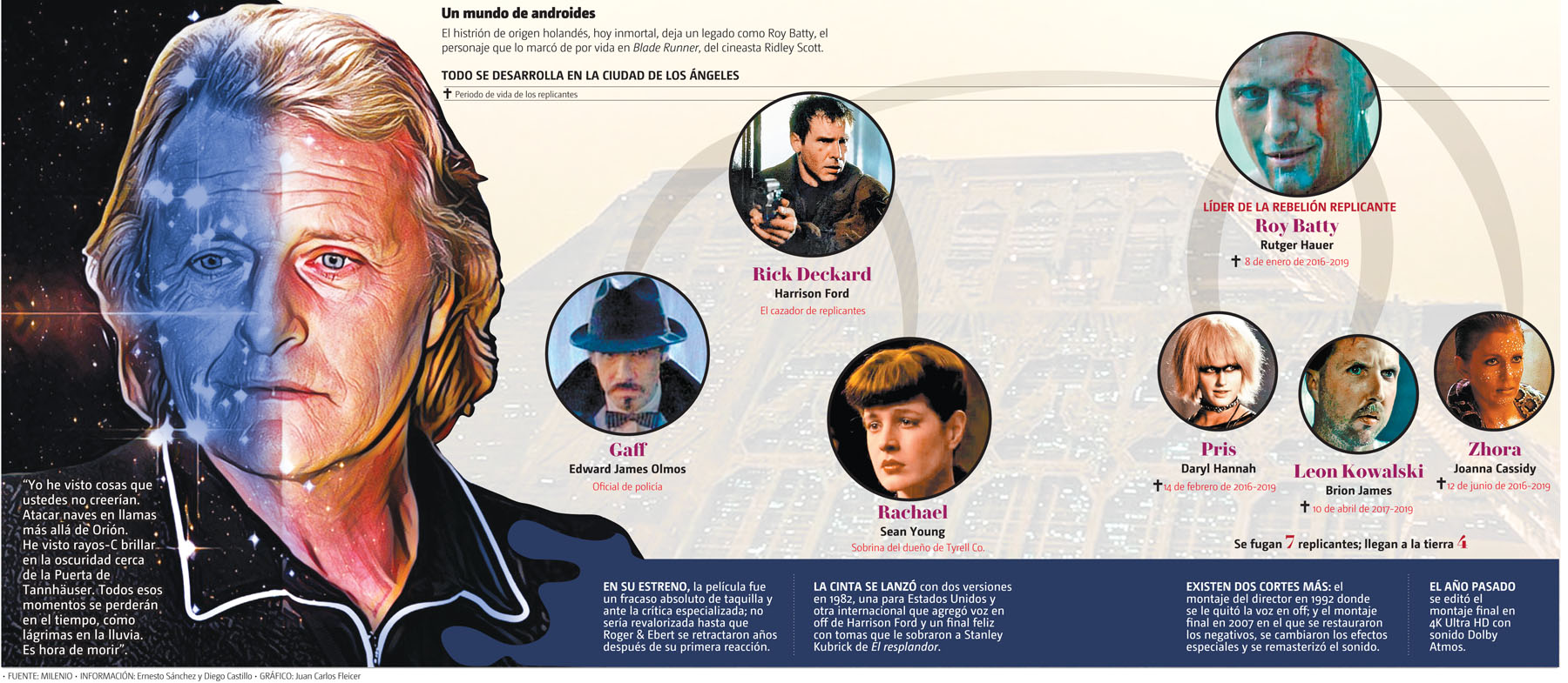 “Yo he visto cosas que ustedes no creerían. Atacar naves en llamas más allá de Orión. He visto rayos-C brillar en la oscuridad cerca de la Puerta de Tannhäuser. Todos esos momentos se perderán en el tiempo, como lágrimas en la lluvia. Es hora de morir”.