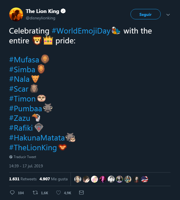 Con motivo del Día Mundial del Emoji y el estreno del live action de El rey león (el 19 de julio), la cuenta de Twitter de la película lanzó emojis especiales. En estos se puede ver a los personajes principales: Mufasa, Simba, Nala, Timon, Pumba, Scar, Zazuu, Rafiki e, incluso, los hashtags #HakunaMatata y #TheLionKing.