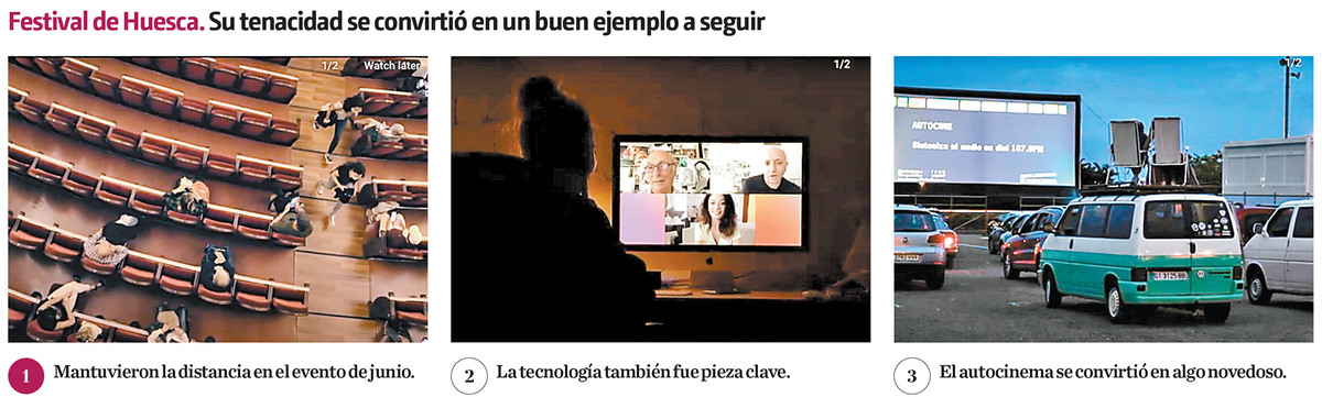 En la parte internacional, el festival de Huesca fue el primero en abrir con una edición presencial en su teatro sede y un autocinema, así como gran parte de su programación en línea; le seguirá en septiembre el Festival de Cine de San Sebastián (SSIFF), el cual abre su edición 2020 con la proyección de Rifkin’s Festival, la nueva cinta de Woody Allen.