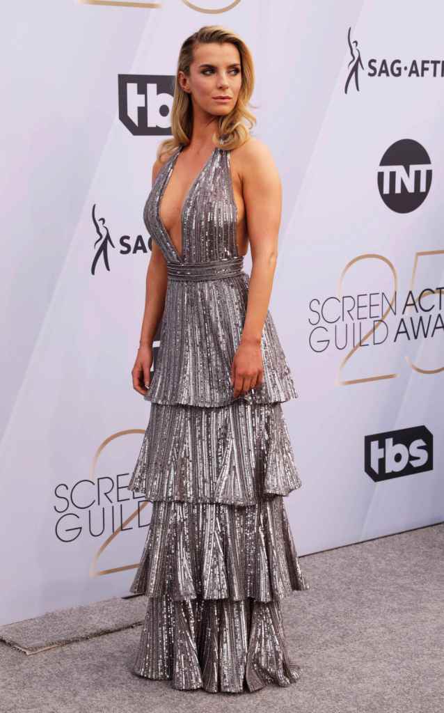 La nominada a Mejor interpretación de reparto de una serie de comedia siguió la tendencia del evento y al igual que varias de las invitadas lució un atuendo en tonos metálicos, sin embargo, el corte de su vestido no ayudó a estilizar su delgada figura.