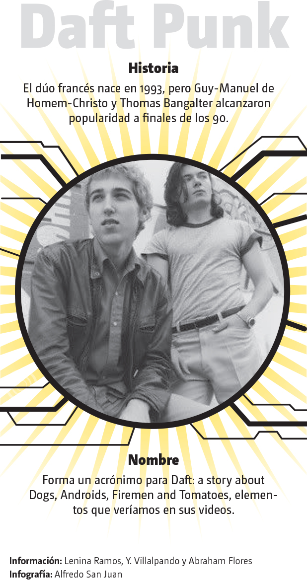Daft Punk es un dúo de música electrónica formado en 1993 por los músicos franceses Guy Manuel de Homem-Christo y Thomas Bangalter, que alcanzaron gran popularidad a finales de los 90's. Inspirados en bandas como The Beatles, The Beach Boys y The Rolling Stones, su vestimenta, sonidos y sampleos estuvieron inspirados en el concepto de la banda francesa Space.