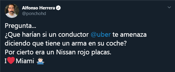 “Pregunta… ¿Qué harían si un conductor de Uber te amenaza diciendo que tiene un arma en su coche? Por cierto, era un Nissan rojo. Yo amo Miami”, se lee en la publicación de Herrera.