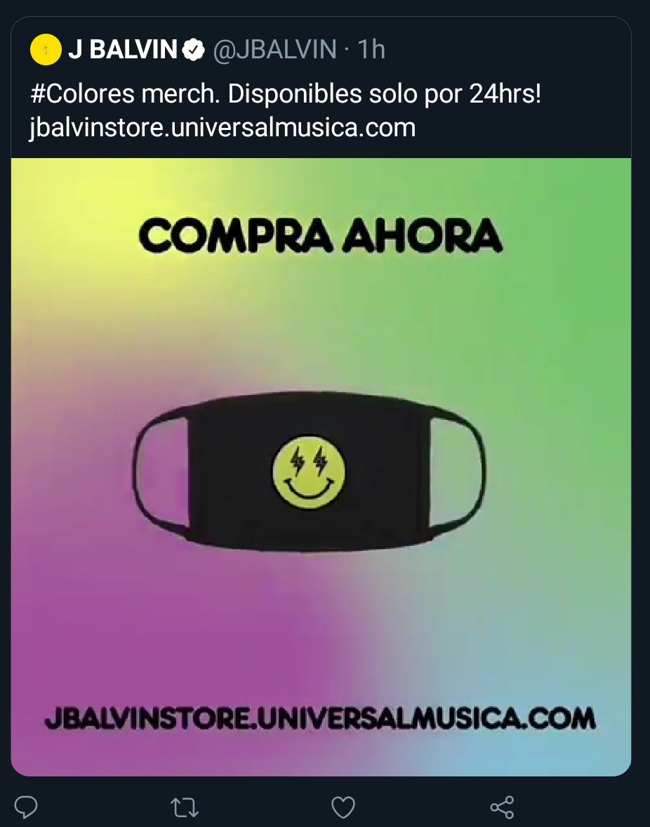 En el anuncio se puede ver las mascarillas que vende J Balvin con su sello personal, la cara de smile que siempre aparece en sus atuendos. Los internautas le señalaron al cantante sobre su falta de sensibilidad con el mensaje.