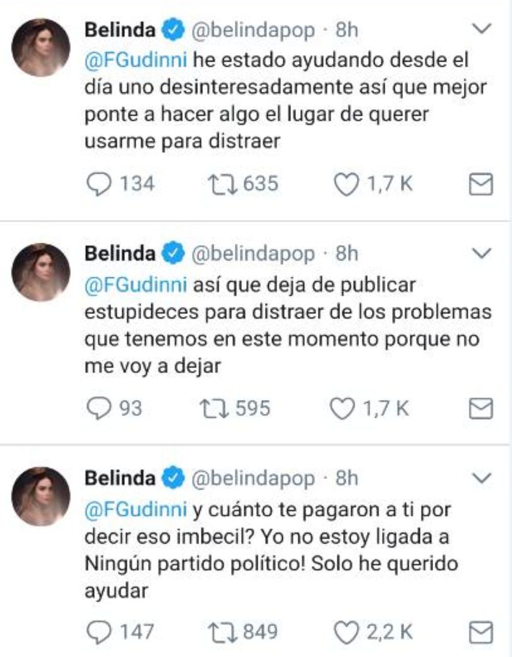 Tras los fuertes sismos que azotaron el territorio nacional en 2017, Belinda compartió fotografías ayudando en zonas afectadas, por lo que fue acusada de ser parte de una campaña política.