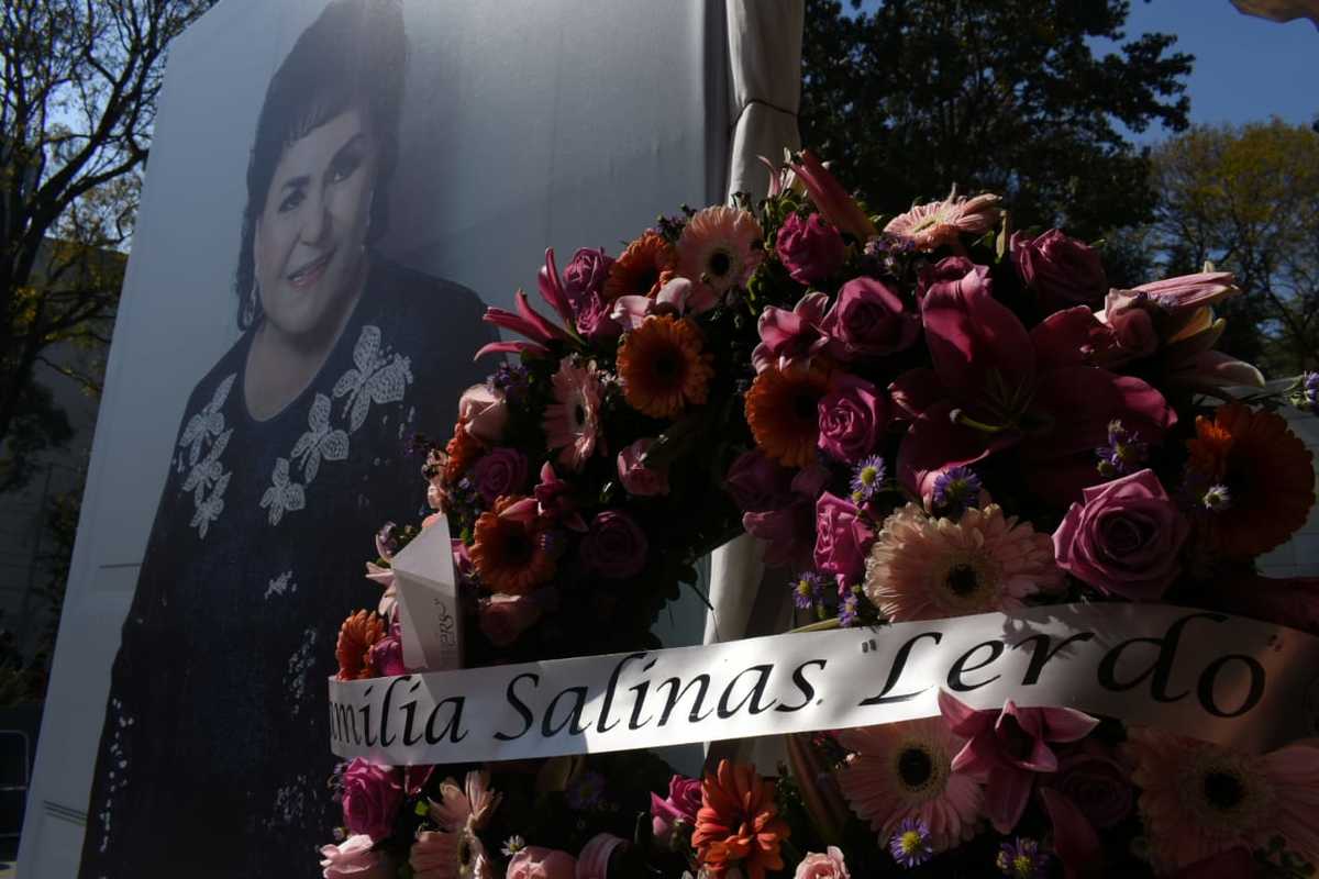 En el escenario, las imágenes de Carmen Salinas se replicaron y formaron parte de la escena, donde los arreglos florales y coronas que enviaron sus amigos como Lucha Villa, Patricia Reyes Spíndola se suman a la imagen de la Virgen de Guadalupe y el Sagrado Corazón de Jesús que acompañan el homenaje.