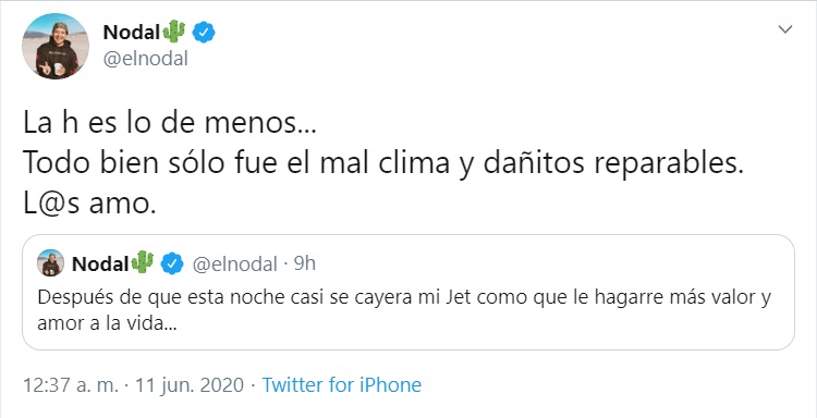 “La h es lo de menos… Todo bien, sólo fue el mal clima y dañitos reparables. Los amo”, tuiteó.