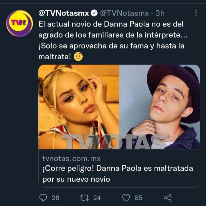 Mediante su cuenta de Twitter, Danna Paola explotó contra TV Notas. Catalogó a la revista como un medio amarillista. Además, pidió que no subestimen su valentía y fuerza. Resaltó que ella no se deja maltratar ni por un novio ni por nadie.