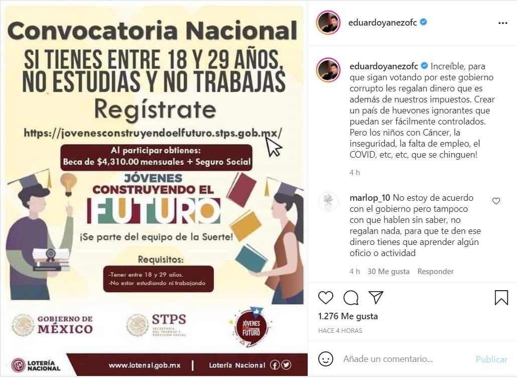 Fue a través de Instagram en donde Eduardo Yáñez mostró su postura en contra de “Jóvenes construyendo el futuro”. Para él, este apoyo se trata de darle dinero a “los huevones ignorantes”.