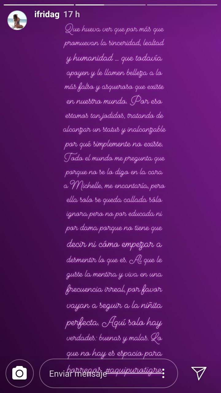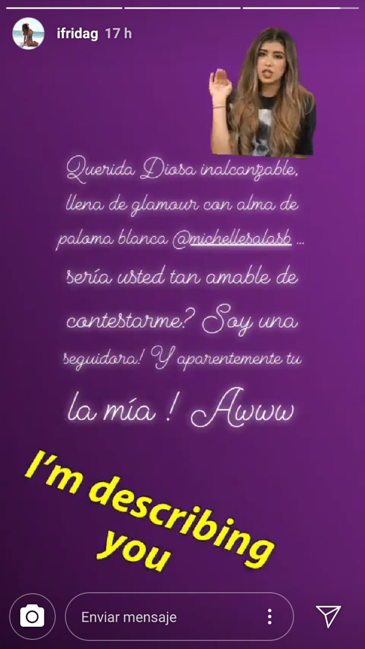 Posteriormente, Frida Sofía se refirió directamente a la hija de Luis Miguel: "querida diosa inalcanzable, llena de glamour, con alma de paloma blanca, Michelle Salas, ¿sería usted tan amable de contestarme? ¡Soy una seguidora! ¡Y aparentemente tú la mía!".