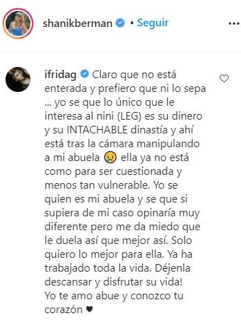 “Yo sé quién es mi abuela y sé que si supiera de mi caso opinaría muy diferente, pero me da miedo que le duela así que mejor así. Solo quiero lo mejor para ella. Ya ha trabajado toda la vida. ¡Déjenla descansar y disfrutar su vida! Yo te amo abue y conozco tu corazón”, señaló.