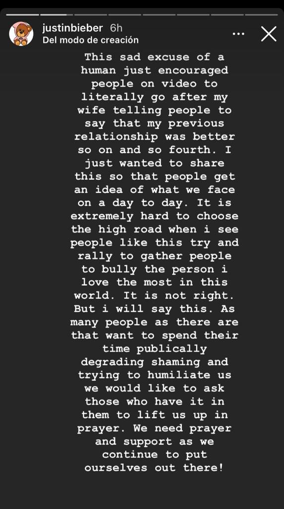 "Este ser humano alentó a otras personas en un video a literalmente ir tras mi esposa, diciéndole que mi relación anterior era mejor", escribió Justin Bieber.