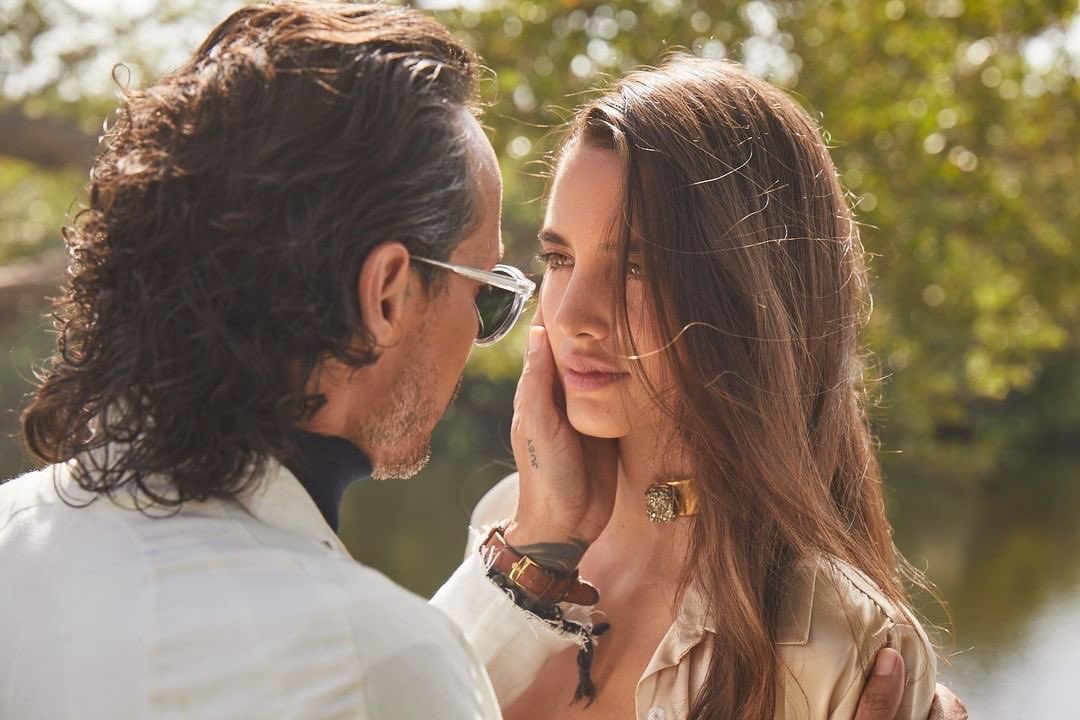 En la primera imagen se observa a Marc Anthony sentado sobre un campo de flores mientras abraza y toma la mano derecha de la modelo, quien luce un elegante vestido de color rosa palo con transparencias en la falda.