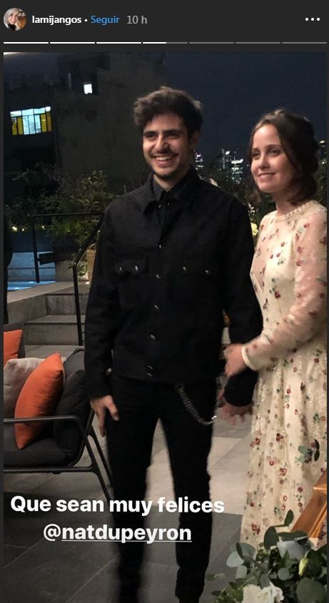 En sus historias de Instagram, la actriz compartió fotografías de la fiesta en donde lució un vestido de la firma española Immaclé Novias que acompañó con un sencillo arreglo floral como ramo, mientras que Yago Muñoz optó por un atuendo totalmente negro.