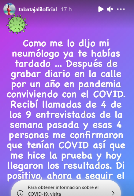 Asimismo, Tábata Jalil contó que seguirá un tratamiento y que incluso su neumólogo le informó que ya se había tardado a dar positivo al covid-19:
