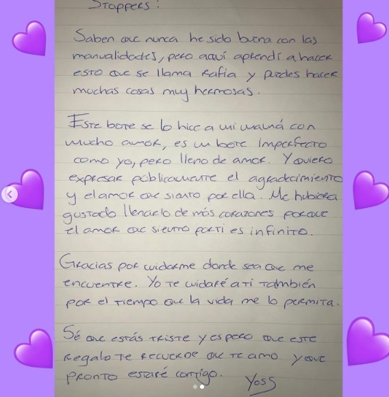 “Gracias por cuidarme donde sea que me encuentre. Yo te cuidaré a ti también por el tiempo que la vida me lo permita. Sé que estás triste y espero que este regalo te recuerde que te amo y que pronto estaré contigo”, escribió YosStop en la carta sobre su madre.