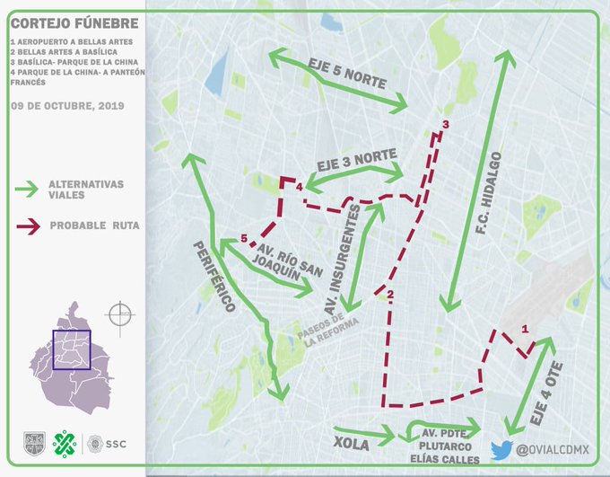 Ésta es la ruta que seguirá el cortejo fúnebre con las cenizas de José José, desde su llegada, hasta su paso por Bellas Artes, la Basílica de Guadalupe, Clavería y el Panteón Francés.