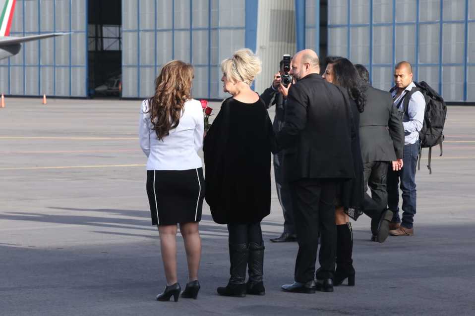 Anel Noreña, ex esposa del músico, se encuentra en la pista de aterrizaje del Sexto Grupo Aéreo y Personal Militar, antes Hangar Presidencial FAM Fuerza Aerea Mexicana.