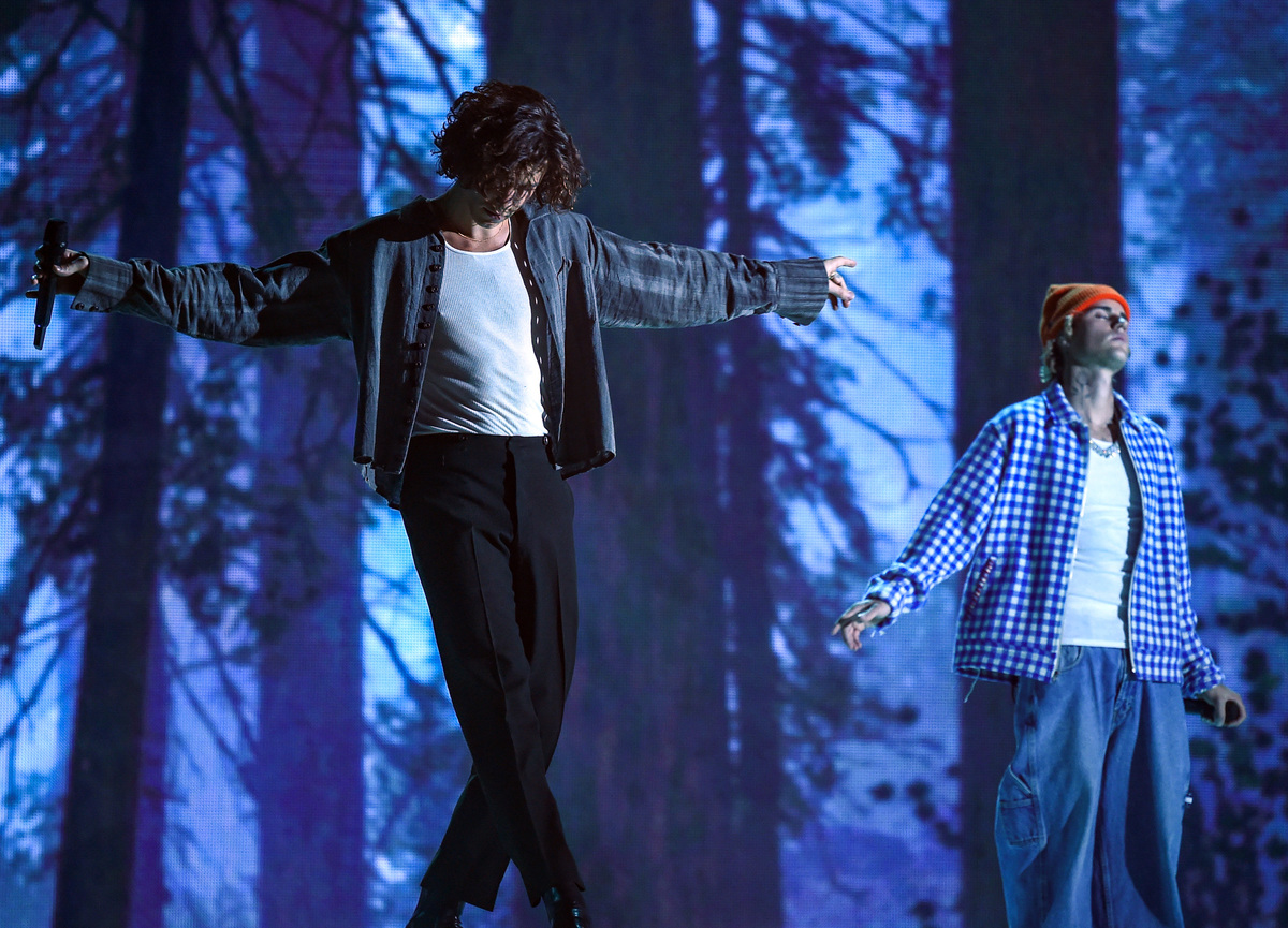 Vestido a cuadros, con un gorro rojo y pantalones de mezclilla, y después de casi cinco años de ausencia en los escenarios, la gala arracó con la presentación de Justin Bieber, quien cantó Lonely tema que lanzó en octubre pasado.