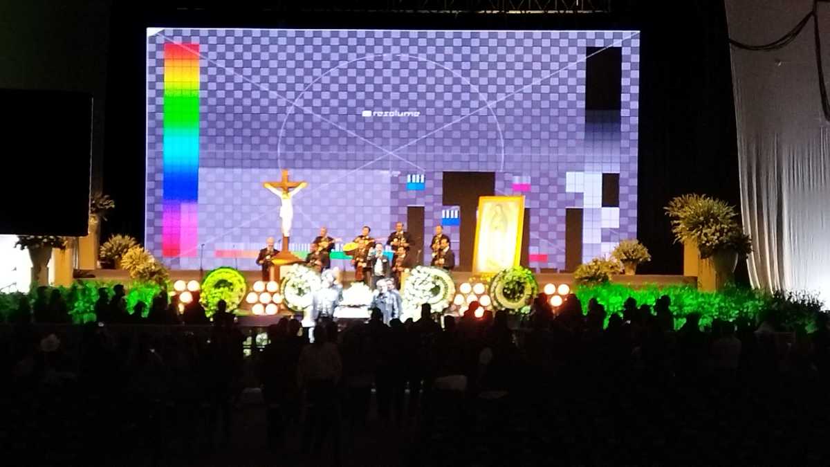 Algunos asistentes, con visible emoción, entonan los temas de su ídolo y llevan hasta el escenario, en donde se colocó una Virgen de Guadalupe, coronas y arreglos florales.