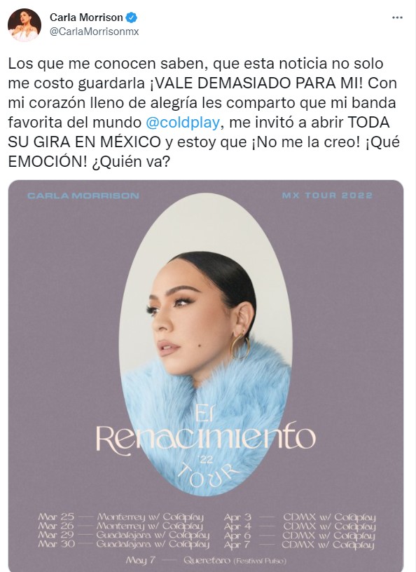 La cantante mexicana Carla Morrison reveló tres nuevas fechas de los conciertos de Coldplay en México; en sus redes sociales la intérprete de Te regalo compartió sus sentir de ser telonera de la banda inglesa, sin embargo cometió el error de adelantar tres fechas.