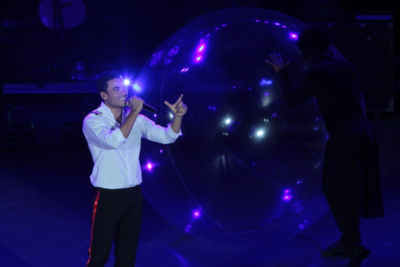 Carlos Rivera ofreció un concierto con 24 canciones, seis bloques y diversos cambios de vestuario, pasando de las melodías rápidas a las letras románticas, del desamor a los mensajes de fuerza, del acompañamiento de bailarines al humo y hasta el uso de un paracaídas; con luces y músicos que completan un show donde recuerda su experiencia en los musicales.