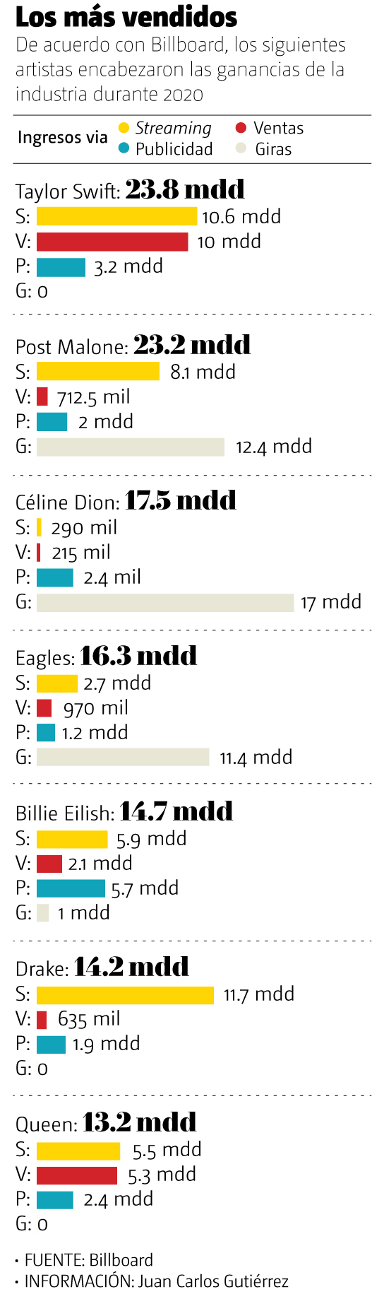 “La pandemia frenó conciertos y giras de diversos cantantes, los artistas tuvieron que reinventarse y algunas de las alternativas fueron los conciertos vía streaming o la venta de sus catálogos musicales, que también pueden monetizarse en estas plataformas, y en su mayoría consisten en los grandes éxitos, pues estos aún cuentan con derechos de autor vigentes que siguen generando ganancias a los artistas mediante las plataformas digitales”.