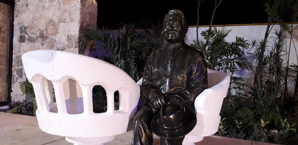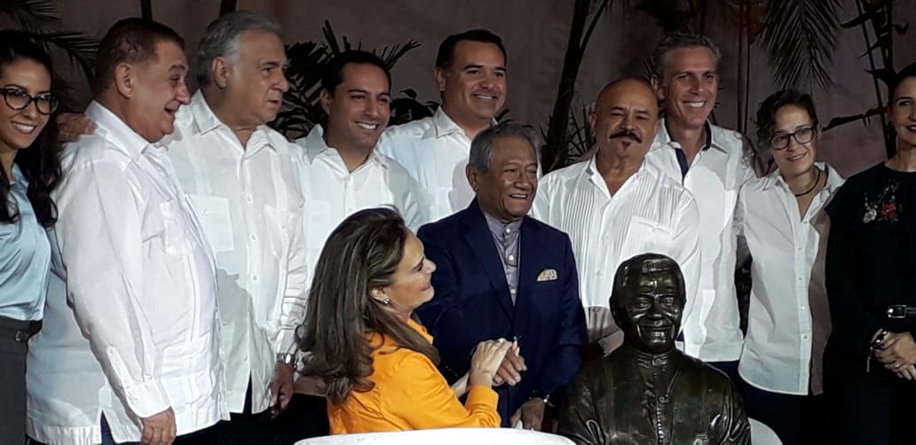 Con los acordes de “Somos novios” sonando en los instrumentos y a la voz de un grupo yucateco, fue como el maestro Armando Manzanero subió al escenario colocado en el patio central de la plaza Paseo 60, a la que acudió para presenciar la develación de una escultura en su honor.