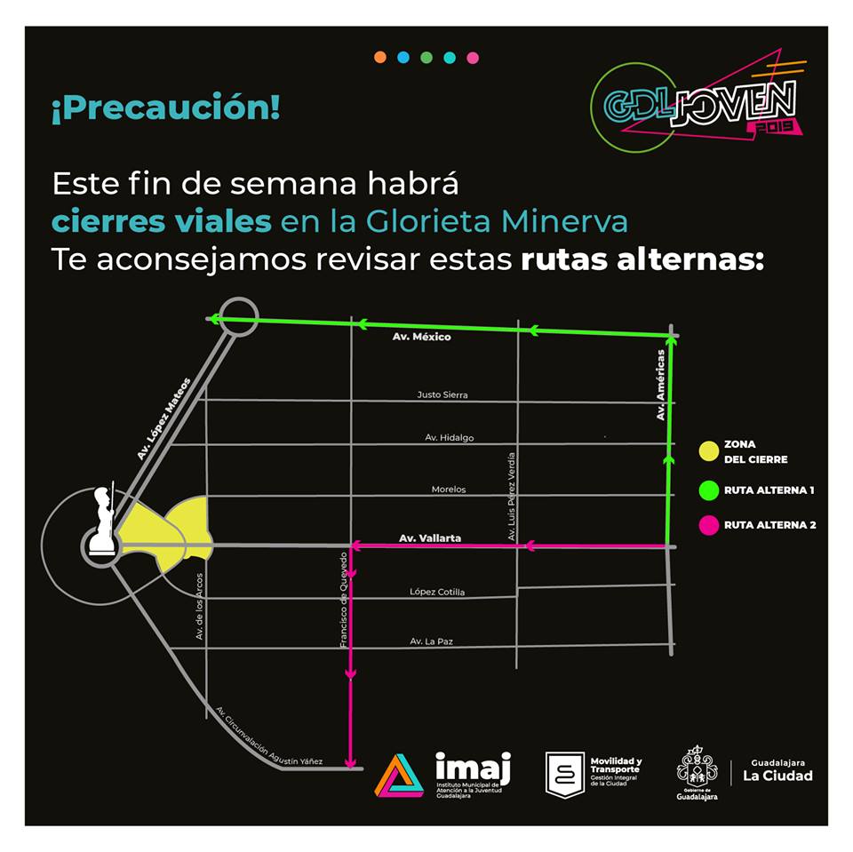 La circulación vial de las avenidas Vallarta y López Mateos, en puntos cercanos a La Minerva, sede del evento, se suspendió desde ayer a las 23:00 horas y se liberarán el domingo por la mañana a las 08:00 horas. Habrá vías alternas según como se puede apreciar en los mapas que pueden consultarse en la página de Facebook del IMAJ. Las recomendaciones generales es que los asistentes no acudan con carriolas, ni objetos punzocortantes, tampoco drogas.