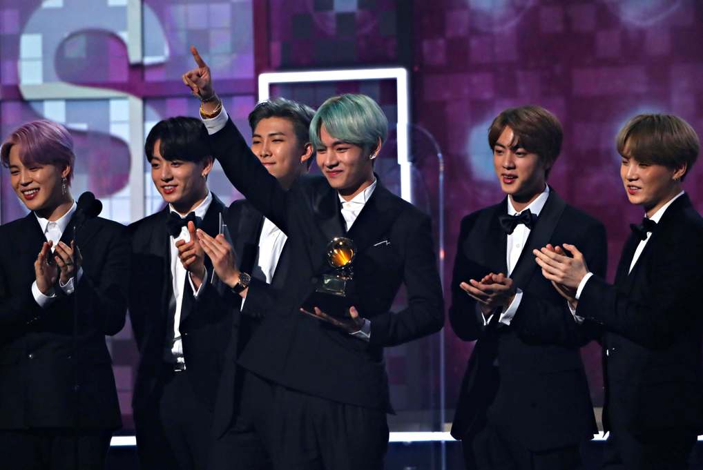 La boyband surcoreana presentó a los nominados en la categoría de Mejor Álbum R&B, para segundos después dar a conocer a H.E.R. como la gran ganadora.