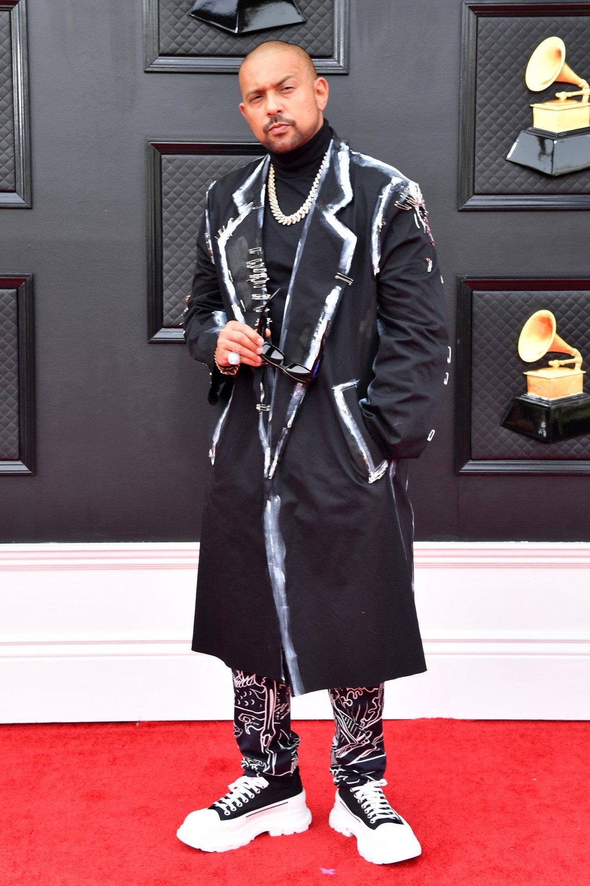 El rapero, cantante y productor jamaicano lució un saco tipo gabardina largo y unos pantalones con estampados en color blanco.