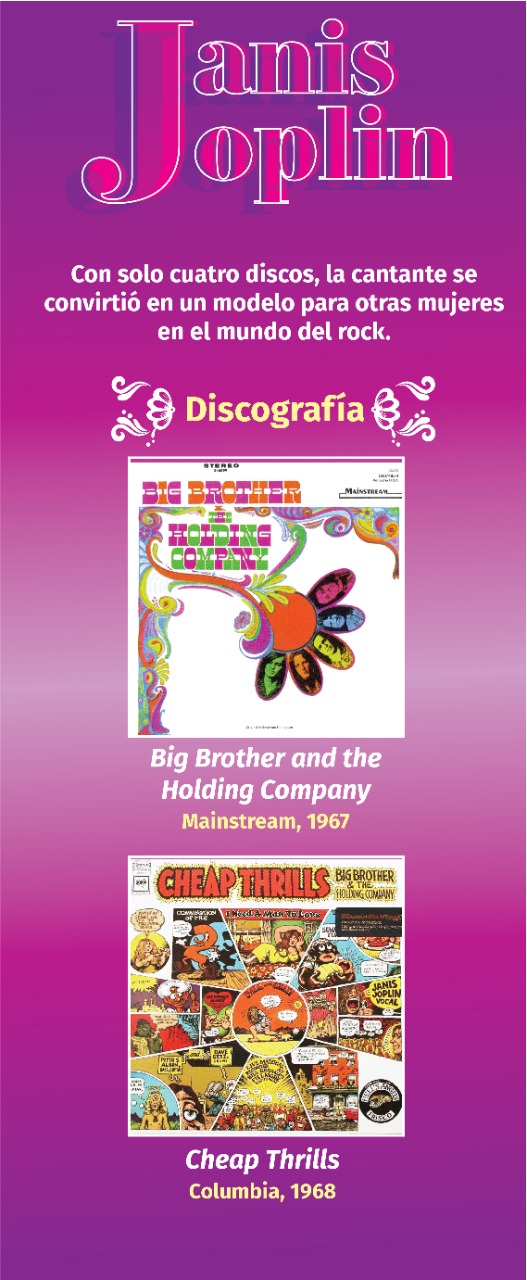 Después de su incendiaria actuación en el Monterey Pop Festival con Big Brother & The Holding Company en 1967, grabó el mismo año su primer disco, bautizado con el nombre del grupo, el cual no tuvo gran repercusión. La explosión llegó al año siguiente con Cheap Thrills, que en un mes vendió un millón de copias. El álbum, con dibujos del irreverente George Crumb en la portada, incluye tres versiones estrujantes de “Summertime” de George Gershwin, “Ball and Chain” de Big Mama Thorton y “Piece of my Heart” de Jerry Ragovoy y Bert Berns. También muestra su progreso como compositora en “I Need a Man to Love” y “Turtle Blues”.