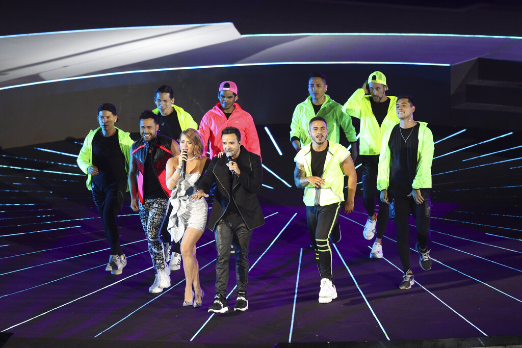 Fonsi, vistió jeans, blazer negro y playera negra; mientras sus acompañantes usaron prendas color neón.Anteriormente, el puertorriqueño reaccionó ante la renuncia del gobernador de Puerto Rico Ricardo Roselló, quien posteó en Twitter una imagen de la bandera de su país con el mensaje "Nuestro pueblo no se dio por vencido".
