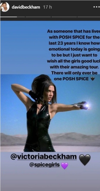"Como alguien que ha vivido con la Posh Spice durante los últimos 23 años, sé lo emocionante que va a ser el día de hoy, así que quiero desearles a todas las chicas buena suerte en esta increíble gira", escribió el ex futbolista David Beckham y agregó que "POSH SPICE sólo hay una, hoy y siempre".