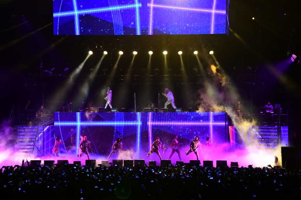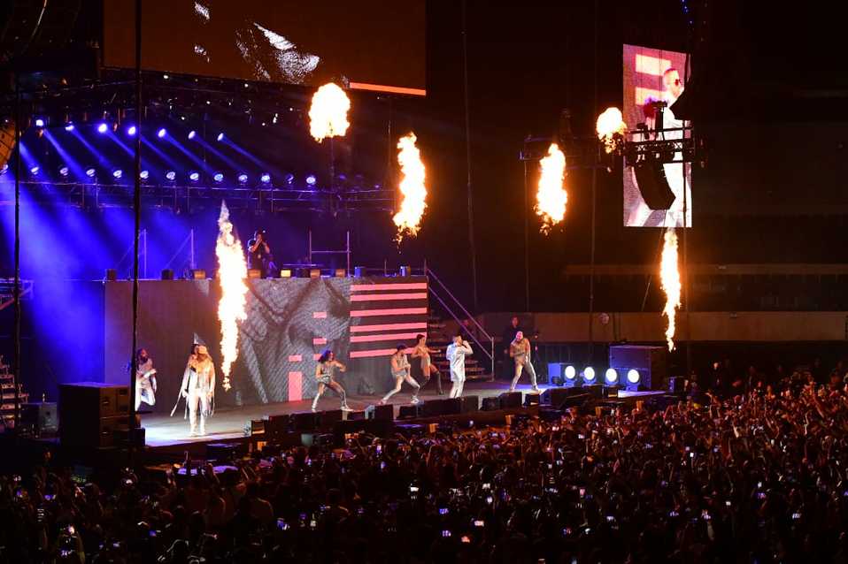 Luces de colores, fuego, humo, pirotecnia y pantallas gigantes que trasmitían videos dieron color al espectáculo; mientras que ellos lucieron múltiples vestuarios, y en cada tema estuvieron acompañados de bailarines.